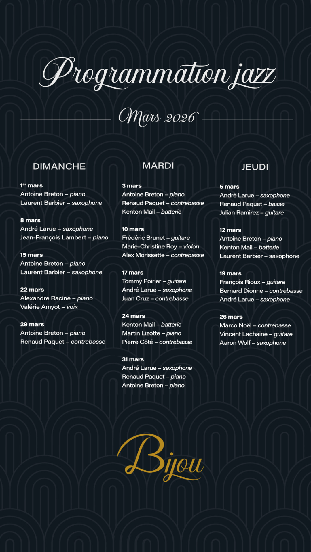 Plongez-vous dans l’ambiance feutrée du Bijou pour une soirée de jazz inoubliable ! Tous les jeudis, de 18h à 21h, laissez-vous charmer par les mélodies envoûtantes d’artistes talentueux et de leur instrument de prédilection. Profitez de ce moment unique pour vous évader entre amis ou en amoureux, tout en savourant nos délicieux cocktails créatifs et nos tapas à partager.